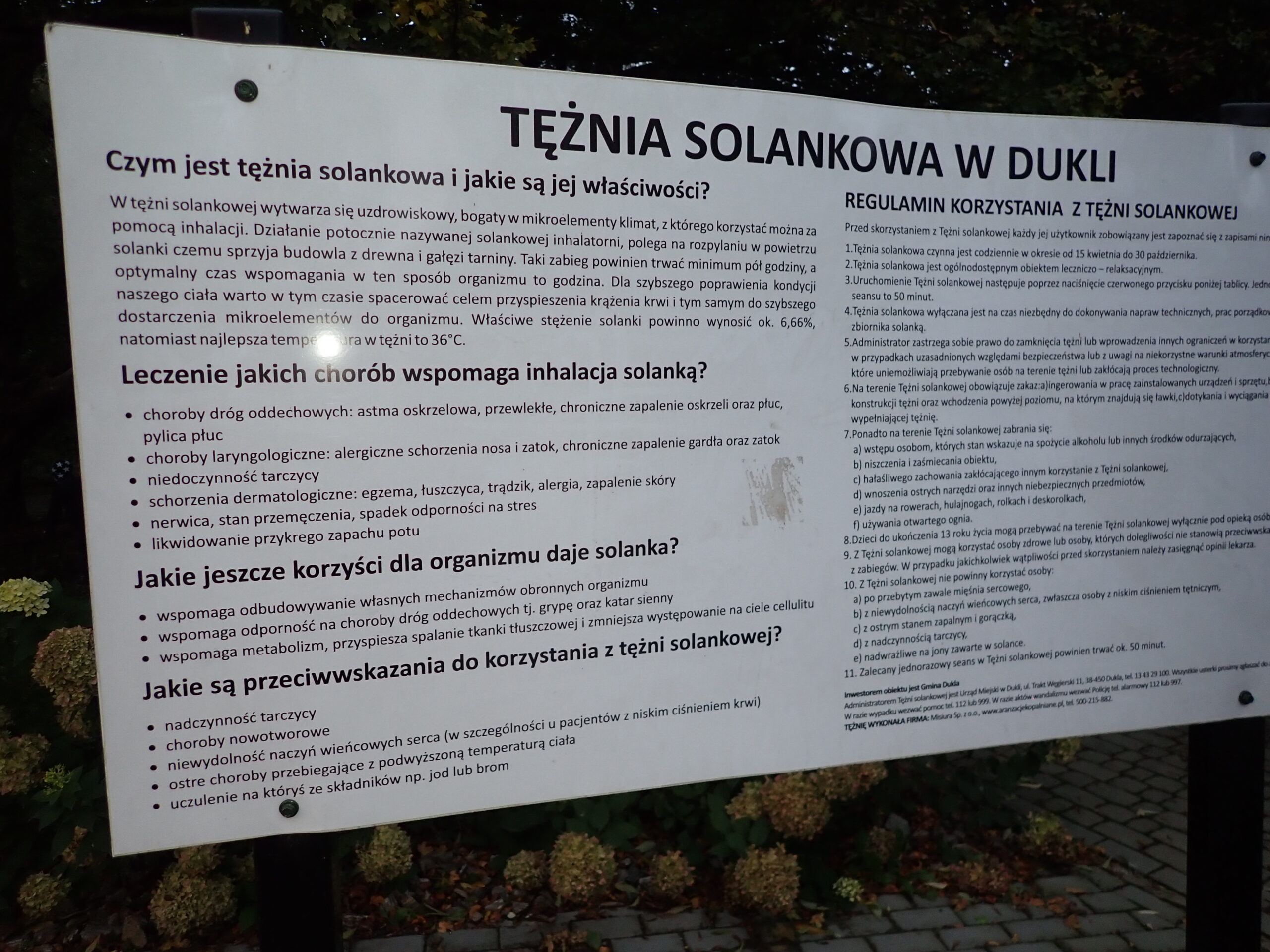Tężnie solankowe w Dukli mają przede wszystkim walory terapeutyczne. Już dawno bowiem udowodniono pozytywne działanie wdychanego powietrza, które w połączeniu z wodą i solą tworzy odpowiednią mieszaninę inhalacyjną. Przekłada się to oczywiście na korzyści dla układu oddechowego oraz poprawę samopoczucia. Tężnia solankowa w Dukli jest ponadto warta uwagi wieczorem, gdyż dzięki oświetleniu i szumowi spływającej wody, powstaje tam relaksujący klimat.