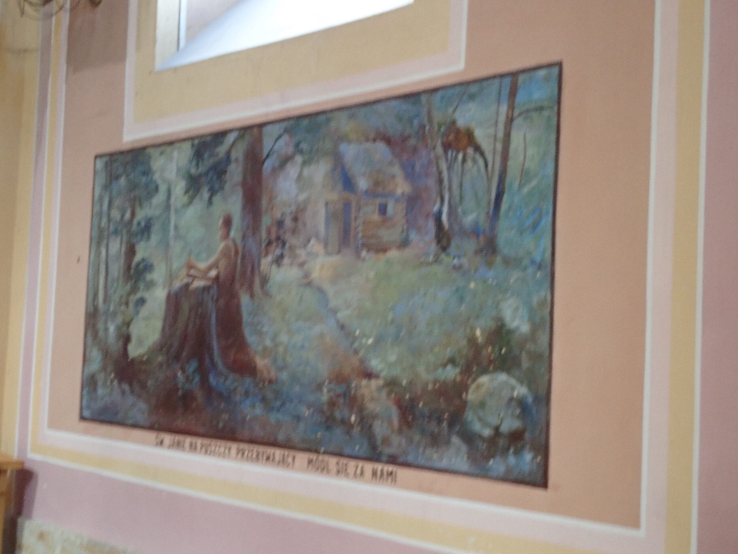 Na ścianie bocznej znajduje się obraz przedstawiający oczywiście, modlącego się na puszczy świętego Jana.